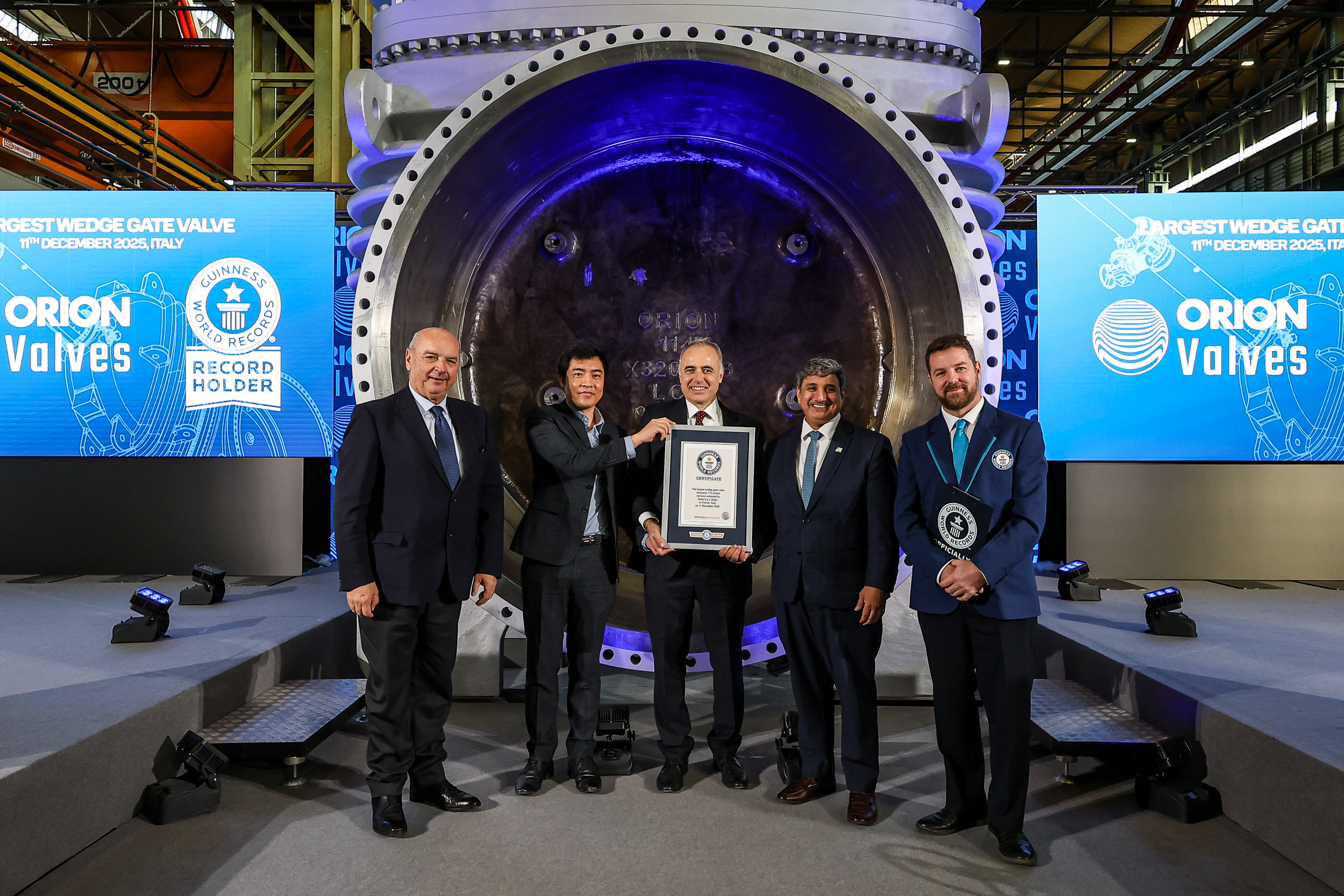 Orion Valves has entered the Guinness World Record book for the largest wedge gate valve ever manufactured, marking a milestone in its 75th anniversary year. A Guinness World Record adjudicator officially certified the achievement during a presentation event, recognizing the Trieste-based company’s successful completion of a valve with a 114-inch classification.